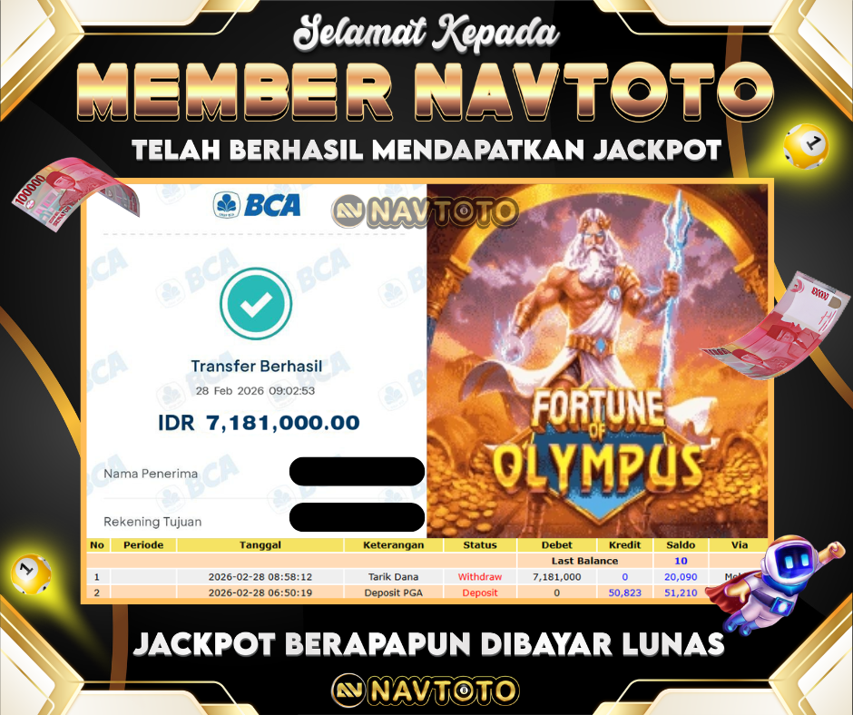SELAMAT KEPADA MEMBER NAVTOTO! user id : he****mn Telah berhasil mendapatkan jackpot di game Fortune Of Olympus! Kemenangan...