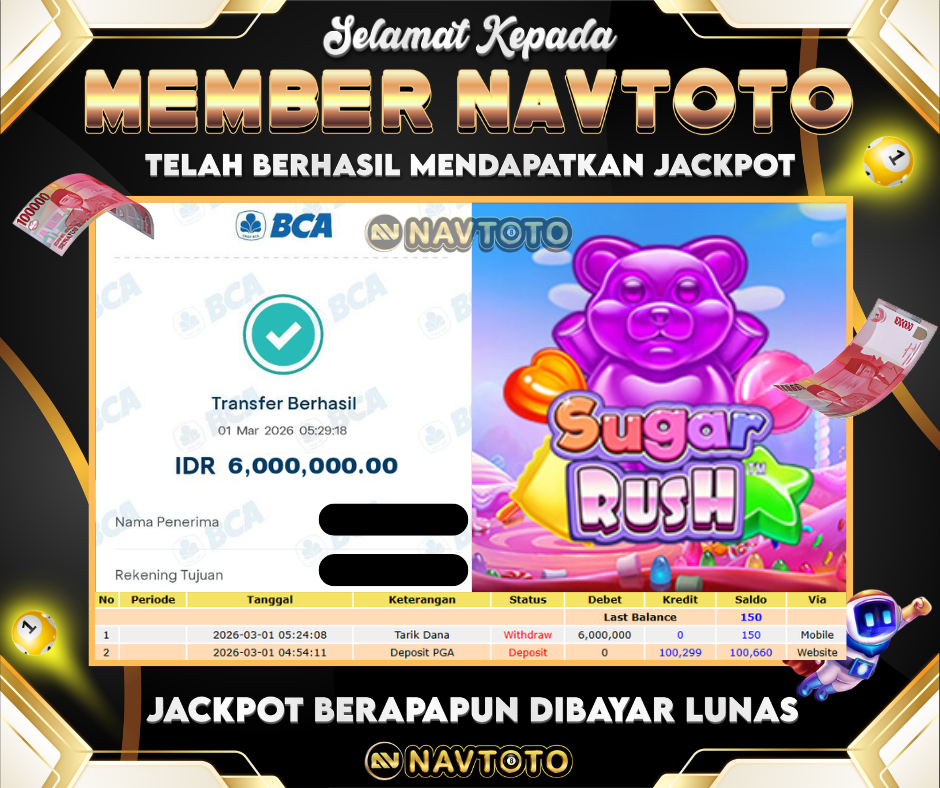 SELAMAT KEPADA MEMBER NAVTOTO! user id : ho****pt Telah berhasil mendapatkan jackpot di game Sugar Rush! Kemenangan langsung...