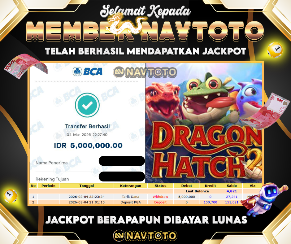 SELAMAT KEPADA MEMBER NAVTOTO! user id : di****mo Telah berhasil mendapatkan jackpot di game Dragon Hatch! Kemenangan langsung...