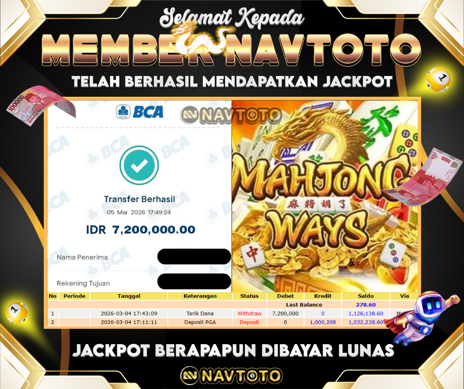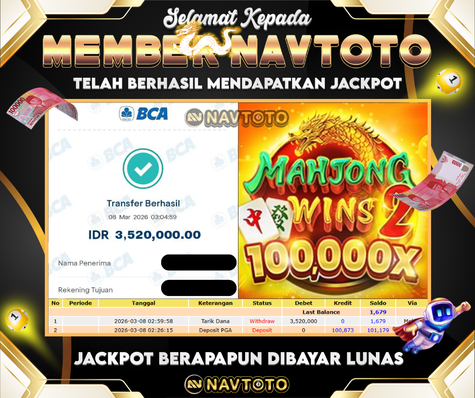 SELAMAT KEPADA MEMBER NAVTOTO! user id : as****ak Telah berhasil mendapatkan jackpot di game Mahjong Wins 2! Kemenangan...
