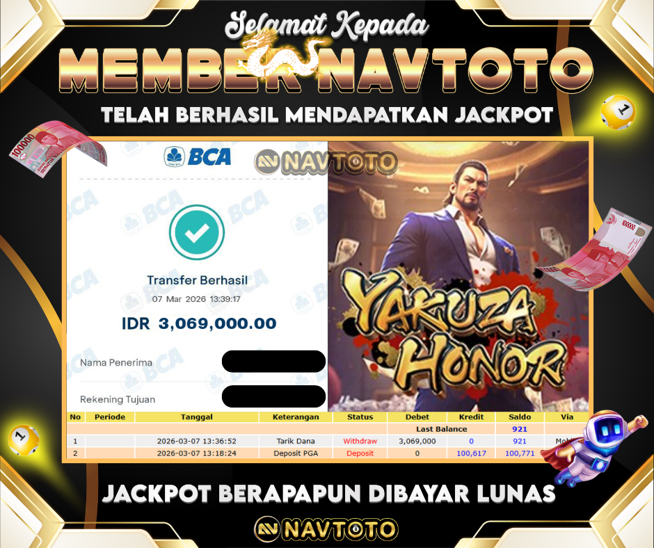 SELAMAT KEPADA MEMBER NAVTOTO! user id : hk****11 Telah berhasil mendapatkan jackpot di game Yakuza Honor! Kemenangan langsung...